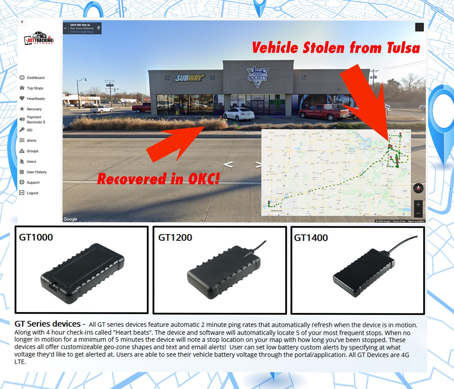 All GT series devices feature automatic 2 minute ping rates that automatically refresh when the device is in motion. Along with 4 hour check-ins called "Heart beats". The device and software will automatically locate 5 of your most frequent stops. When no longer in motion for a minimum of 5 minutes the device will note a stop location on your map with how long you've been stopped. These devices all offer customizable geo-zone shapes and text and email alerts!  User can set low battery custom alerts by specifying at what voltage they'd like to get alerted at. Users are able to see their vehicle battery voltage through the portal/application. All GT Devices are 4G LTE.